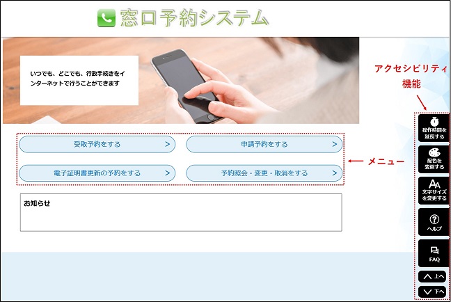 これらのマイナンバーカードの交付(新規発行、更新、再発行など)や電子証明書更新のために、住民様ご自身で来庁の予約を行うことができます。