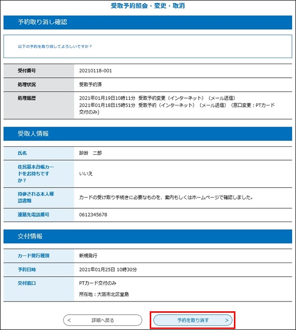 @ 予約詳細画面にて[予約を取り消す]ボタンをクリックすることにより、以下の予約取り消し確認画面に遷移します。