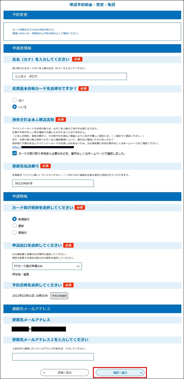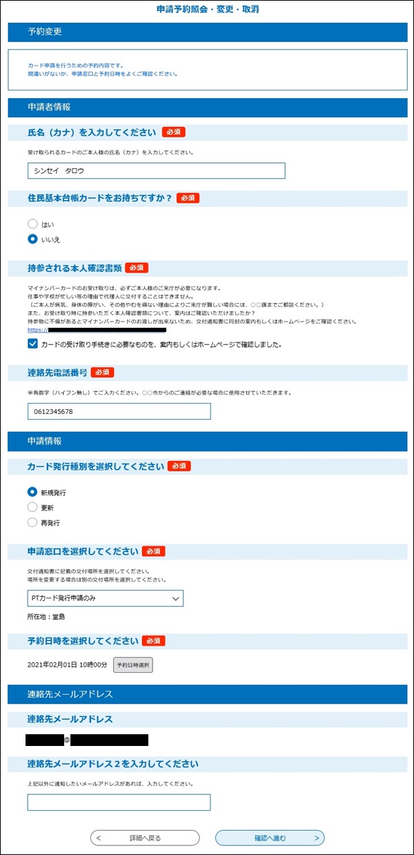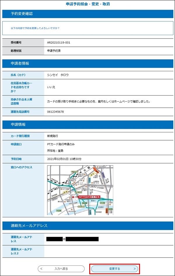 もう一度、変更する場合は[入力に戻る]ボタンをクリックします。