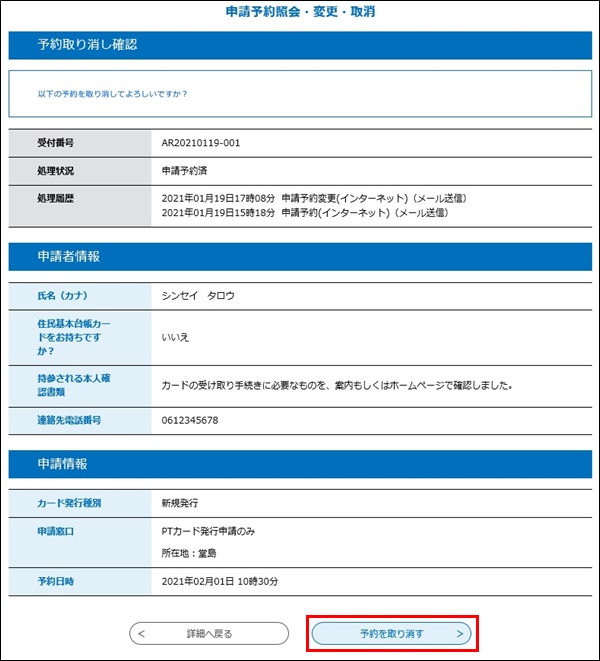 予約詳細画面にて[予約を取り消す]ボタンをクリックすることにより、以下の予約取り消し確認