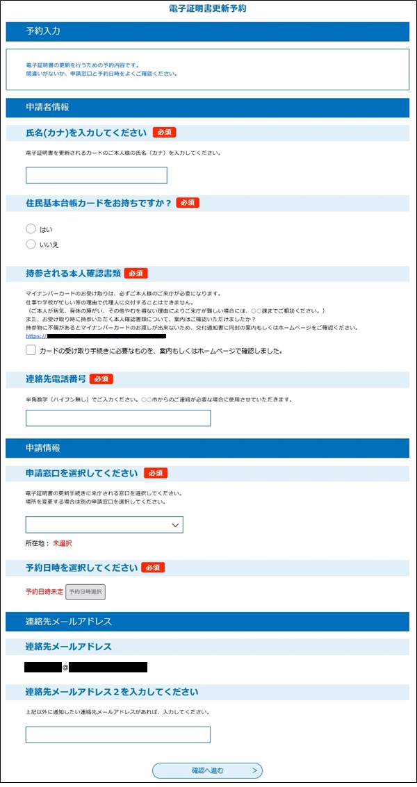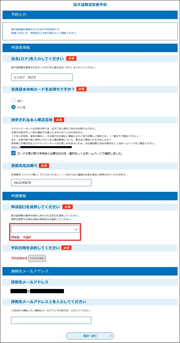 [申請窓口]の入力欄の「∨」をクリックして、電子証明書更新の申請の手続きを行う窓口を選択してください。