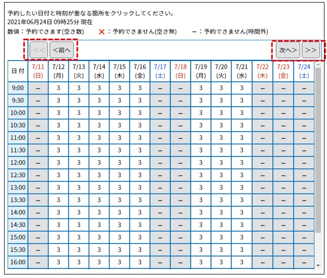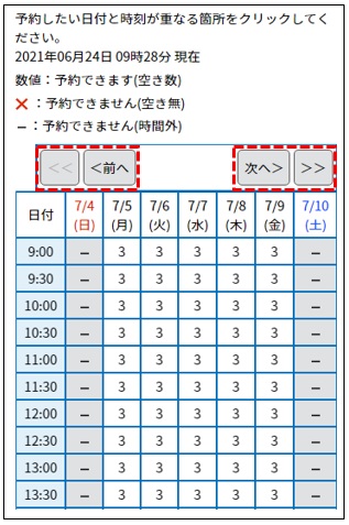 数字が表示されているセルが予約可能な時間帯です。予約したい時間帯のセルをクリックしてください。