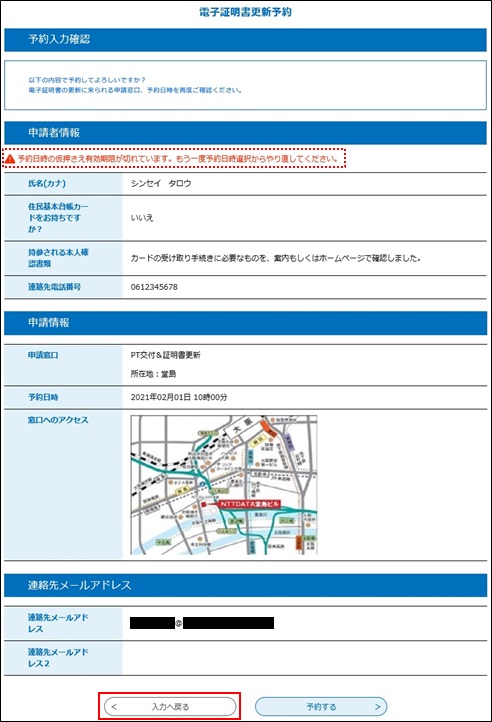 このような場合は、[入力へ戻る]ボタンをクリックして予約入力画面に戻り、