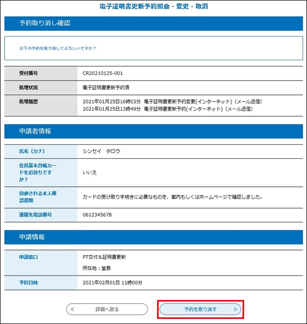 予約の取り消しを行わない場合は、[詳細へ戻る]ボタンをクリックします。