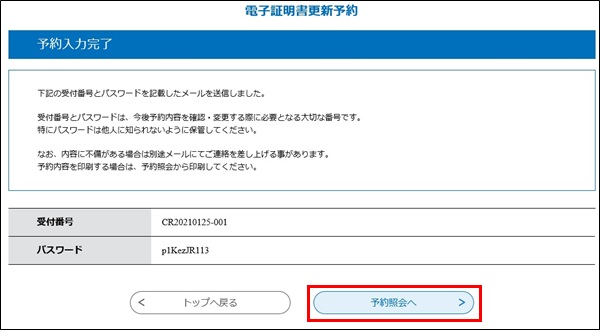 O 処理が正常に終了すると、予約入力完了画面が表示され、【予約完了通知メール】が送信されます。